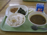 本日は夏野菜カレーをメインに、カレーの付け合わせとなる大豆のカリカリ揚げ、ツナとひじきをあわせたホウレンソウのサラダ、少し大きなスポーツ牛乳、そしてデザートとして冷凍リンゴ絵文字:キラキラという献立です。