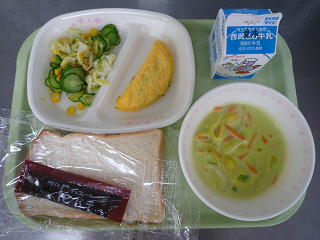 牛乳、山型食パン・チョコパテ、チキンとグリンピースのクリーム煮、