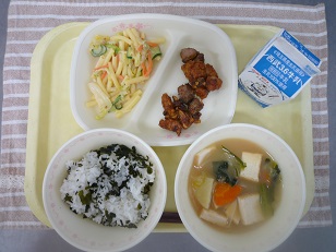 わかめご飯 豚肉の香味揚げ 牛乳