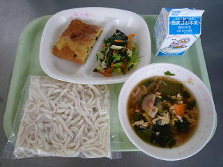 牛乳、玉子とじうどん、抹茶パンケーキ、アスパラ入り野菜炒め