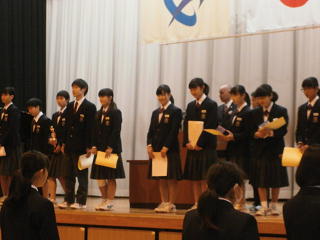 3月26日に、平成29年度深谷中学校修了式が行われました。それぞれの学年の課程を終了したことを示す修了証が、校長先生から各学年の代表に手渡されました。また、各学年の代表が「進級にあたって」をテーマに今年度をを振り返り、来年度のへの決意を発表しました。