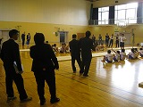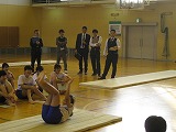 11月12日(月)、埼玉県教育局保健体育課と北部教育事務所の保健体育担当指導主事、そして深谷市教育委員会の指導主事の方々が指導者として、また市内の小・中学校の体育の先生方が深谷中学校に集まり、5時間目に行われた1年3組の保健体育の授業を参観しました。授業内容は「器械運動(マット運動)」です。準備運動に取り入れられていた脚うちは、小学校でもやっていました。補助つき倒立も運動会の組み体操でやっていました。小学校の体育と中学校の保健体育は、つながっているのです。
