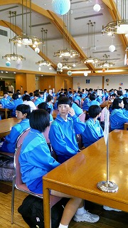 深谷中の2年生を乗せたバス4台は、予定より30分ほど早く新潟県津南町の宿舎「ニューグリンピア津南」に到着しました絵文字:バスバスから荷物を取り出し、ホテルで開校式を行いました。