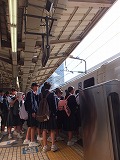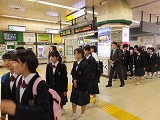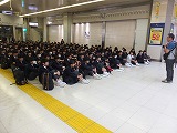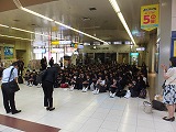 5月27日(日)、この時期なのですでに太陽は顔を出してはいますが、日曜日の早朝ということで街はまだ静まり返っています。まだ6時には少し間があるという時刻に、集合場所となっている熊谷駅の改札前に1人目の3年生がやってきました。この修学旅行にかける気持ちの強さ・熱さを感じます。それほどの時間をおかず次々に深中の制服に身を包んだ生徒たちが集まってきます。