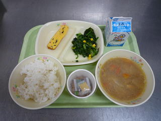 牛乳、ご飯、彩の国納豆、五目厚焼き玉子、和風ほうれん草サラダ、豚汁
