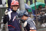 3番バッターのキャプテンが出塁すると、リードを大きく取り上山口中のバッテリーをはじめとする守備陣にプレッシャーを与えます。すると、強い打球を野手がはじいたり、バッテリーミスが続き、キャプテンが先制のホームを駆け抜けました。そこからさらに強打やバントなどを絡めて揺さぶりをかけ、この回一気に6点を入れ試合の流れをつかみました。