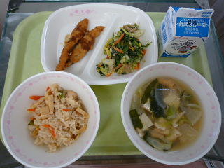 牛乳、たけのこご飯、ししゃもフライ、大根とあさりの味噌汁、ほうれん草のごまあえ