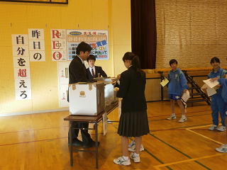 11月1日に、生徒会役員選挙が行われました。立会演説会では立候補者一人一人が、あいさつができる学校、思いやりのあふれる学校、地域との交流を深めたい、意見箱を活性化させたい・・・等々の思いを堂々と発表していました。演説会後は、投票へ。深谷中の「これから」を決める大切な選挙であるという自覚があったためか、ども学年も真剣に考え投票用紙に◯をつけている様子がうかがえました。