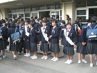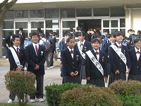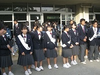 10月17日(水)の朝、アルミ缶回収でごった返していた昇降口前に、生徒会役員選挙に立候補した人たちが、名前を書いた襷を掛けて登場しました。