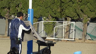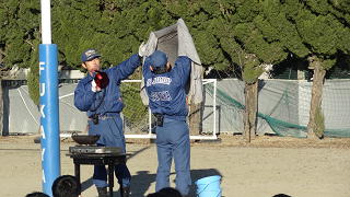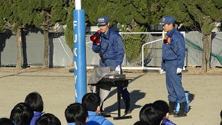 ◯校庭に避難後は、消防隊員の方による鍋の油に火がついた際の消火方法の実演