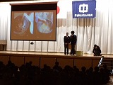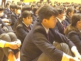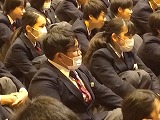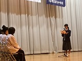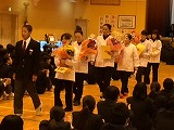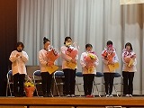 ステージに上がった調理員さんたちに、感謝の言葉とお花、そして改めて拍手で全校生徒と先生たちの感謝の気持ちを贈りました。