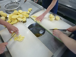 給食室でじゃがいもと人参を、