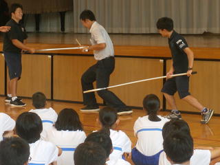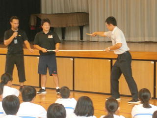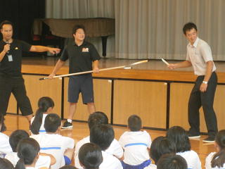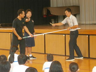 ◯「さすまた」の使い方・・・短く持つと刃物を持っている不審者の場合には刺されてしまいます。長く持ちましょう。