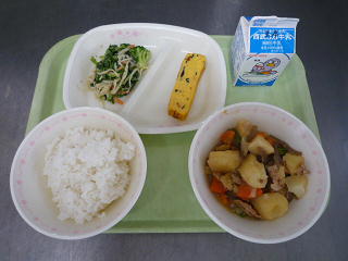 牛乳、ご飯、肉じゃが、厚焼き玉子、ごまマヨサラダ