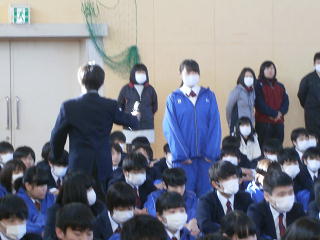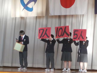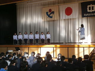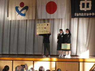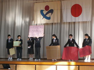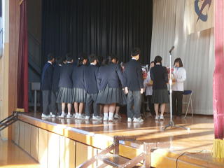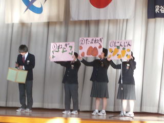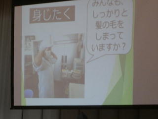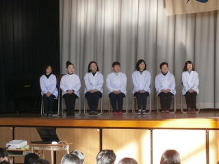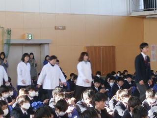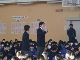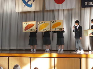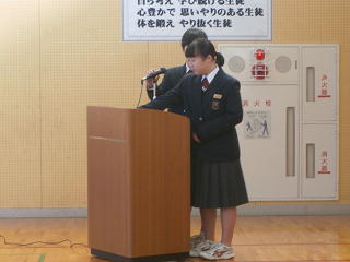 本日、給食週間に合わせて給食集会が開かれました。給食委員を中心に、前半は調理員さんに感謝の会、後半は給食委員会による発表が行われました。