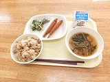 今日は、豚ごぼうのご飯(茶飯)と子持ちししゃもフライ、冬野菜のごまマヨサラダに鋳物汁(川口市の郷土料理)、そして牛乳という和食の献立です。