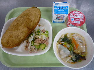牛乳、抹茶入りきなこ揚げパン、わんたんスープ、ヘルシーサラダ、ヨーグルト