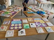 今年度は、3年生の修学旅行と2年生の自然体験宿泊学習という宿泊学習を実施できました。これも3年ぶりのことです。1年生は2月にスキー教室を計画していますが、1学期には総合的な学習の時間に「働く人に学ぶ」学習をしました。各学年のこうした学習について一人一人がまとめた記録を、展示発表してくれました。
