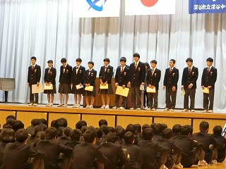 部活動の他にも、英語弁論大会、科学展、人権作文、美術展、発明創意工夫展など、新人戦以後届いた賞状について、延べ120名分の表彰を代表17名がステージに登り全校生徒の前で賞状を受け取りました。
