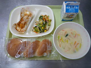 牛乳、ツイストパン、鶏肉のトマトマヨソース焼き、クラムチャウダー、ひじきとコーンのサラダ