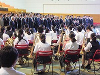7月14日(土)、真っ青な空が広がり朝から真夏のような暑さになりました。夏休みを直前に控えたこの日、ビッグタートルを会場にして深谷青年会議所55周年式典が開かれましたが、その開会行事に深谷中学校と深谷高校の吹奏楽部が合同で参加し、国家や深谷市歌の伴奏を演奏しました。