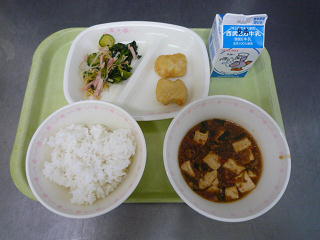 牛乳、ご飯、四川風麻婆豆腐、イカナゲット、もやしのナムル