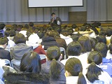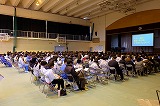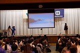 毎年1年生が2月の初めに実施するスキー教室は、第1学年の総仕上げであるとともに深中の先輩となるための大切な行事です。ですから説明会も、生徒たちの実行委員会が司会をしたり企画に関わったりして進めます。もちろん、先生方が登場し説明する部分もありますが、生徒たちの主体的な取組が多くなっています。