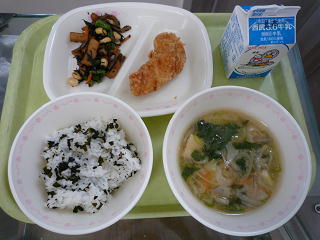牛乳、わかめご飯、鶏の唐揚げ、大豆の磯煮、野菜椀
