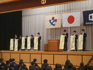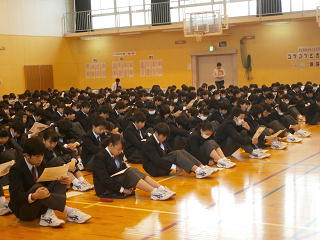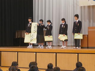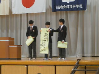 深谷中学校では11月27日から12月8日までを後期人権旬間として、いつも以上に人権について意識する週としています。今日の全校朝会は、人権作文の表彰、人権標語・メッセージの発表、人権作文の発表、そして校長先生の人権講話を盛り込み、学校全体で人権について考える集会となりました。