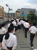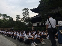 班別行動を終えてホテルに帰ってきた3年生は、17:00といういつもでは考えられない時間に素敵な夕食をお腹いっぱい食べた後、再びロビーに集合しました。しっかりとした構えをつくってロビーに集合した3年生たちは、無言集合ときちんとした整列を、先生たちから注意されることなく、実行委員等のリーダーシップのもとで行うことができました。そして今晩は、京都で最古の禅寺である建仁寺での座禅体験に出かけました。地下鉄の地下通路を鴨川の手前まで通り地上に出ると、鴨川の水面を通ってきた涼しい風が迎えてくれました。少しずつ明るさを失っていく景色の中をさらに歩き、華やかな祇園の中にひっそりとたたずむ建仁寺に到着しました。