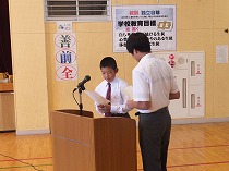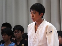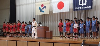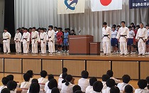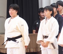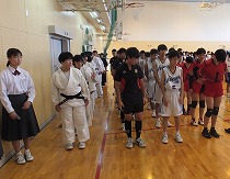 校長と部長会代表から激励の言葉を贈りました。また、県大会に出場する選手を代表して柔道部の部長から、壮行会を開催し全校生徒の応援の気持ちを伝えてもらったことへの感謝と改めての決意が述べられました。