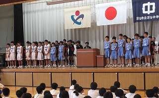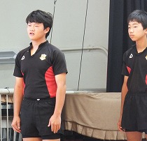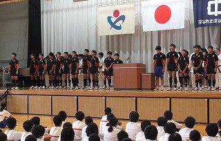 今回県大会に出場するのは、女子バレーボール部、男子バスケットボール部、ラグビー部、男女柔道部、女子剣道部、そして水泳です。ステージには2年生と1年生の全部員が上がり、部長から県大会への決意が述べられました。