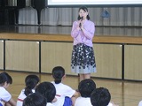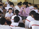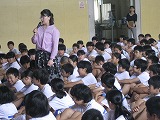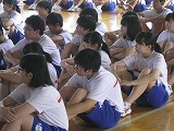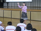 7月12日(木)、期末テストも終わり、1学期も残すところわずかとなってきました。夏休みが近づいていることを実感する熱気漂う体育館で、非行防止教室を開きました。今回は、LINEオフィシャルインストラクターの方に講師をお願いし、「インターネットを使うときに気をつけること、考えること」という演題でお話をしていただきました。