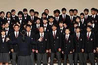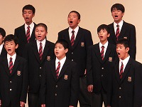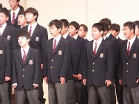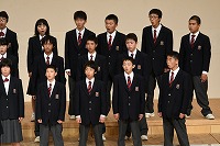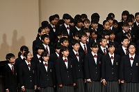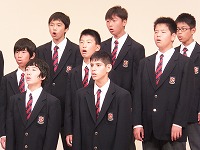 開会行事を終えると、いよいよ1年生の発表です。まずは、学年合唱「My Owu Road -僕が創る明日-」をステージいっぱいの全1年生が合唱しました。
