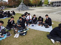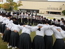 10月26日(金)、1・2年生の合唱で校内音楽会の午前の部が終わり、ここで50分間の昼食・休憩の時間が入ります。生徒たちは各ご家庭で心を込めて作っていただいたお弁当を、文化会館の芝生等でクラスでまとまっていただきます。しかし午後にステージに上がる3年生は、お弁当後の休憩の時間を活用し、クラスそれぞれで練習をし合唱と構えの仕上げをしていました。